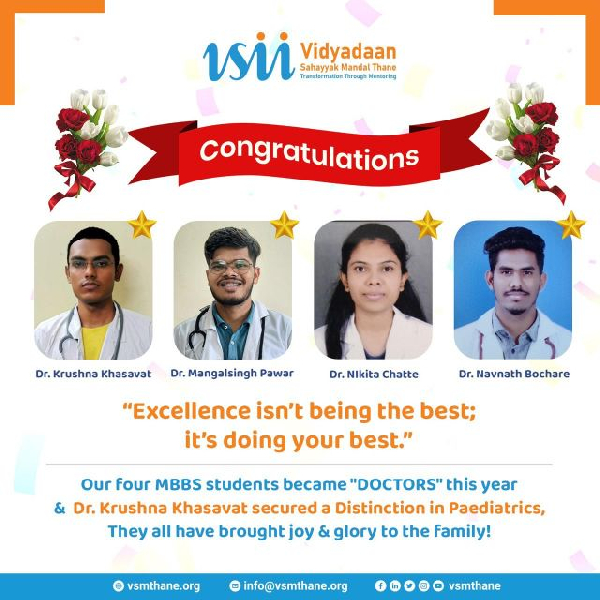 Being a volunteer of Vidyadaan Sahayyak Mandal (VSM), I appeal everyone to support me in this noble cause. VSM Thane has been supporting bright but economically challenged students since 2008 - helping them pursue higher education, gain confidence, and become responsible citizens.